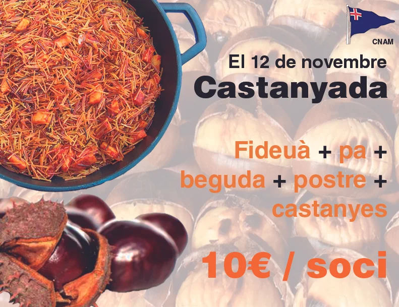 El 12 de novembre celebrarem la castanyada al Club Nàutic d'Arenys de Mar. El Restaurant del Club ens prepararà una fideuada amb pa, beguda, postres i castanyes! Per tan sols 10 € per soci.