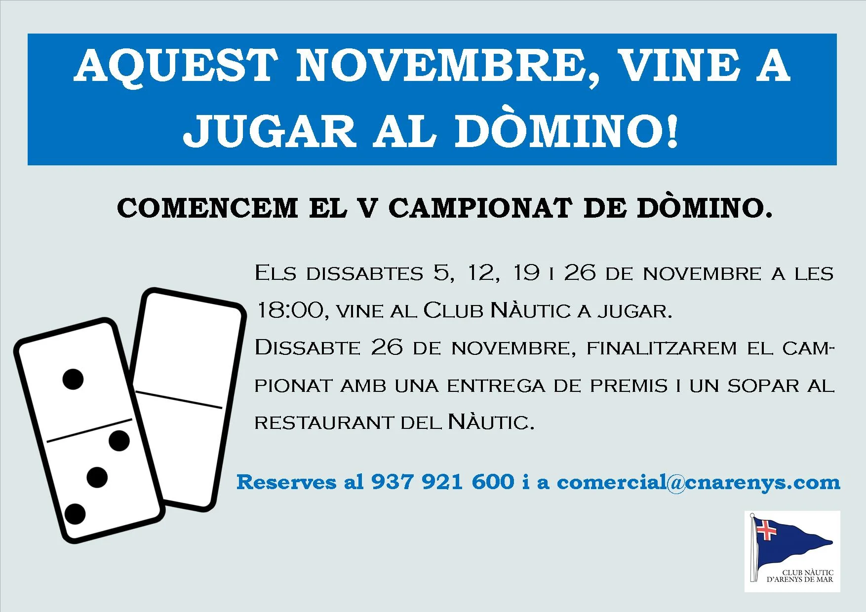 El dissabte 5 de novembre comença el campionat de dòmino i que es disputarà tots els dissabtes de novembre a les 18.00 h en el saló social.