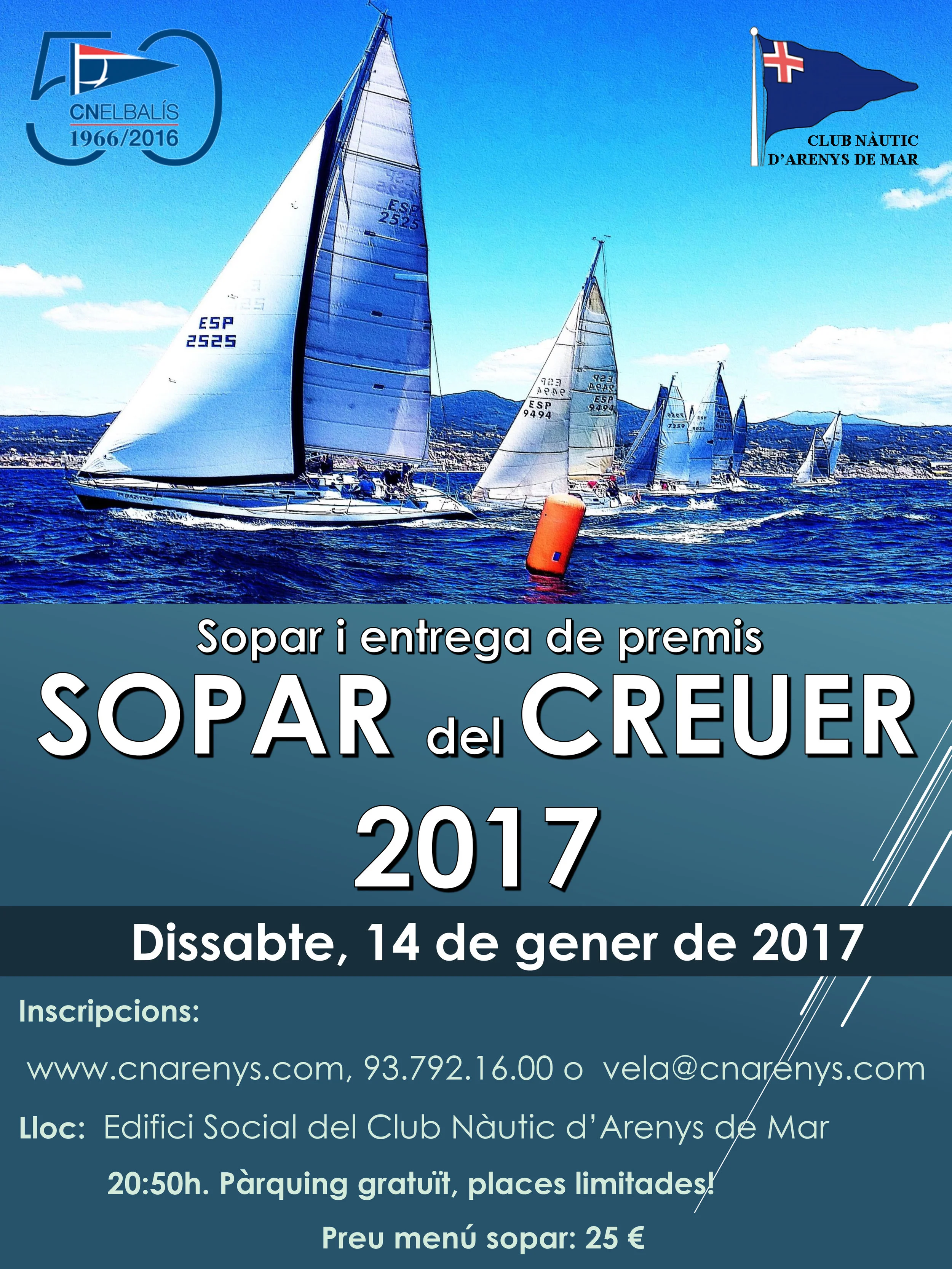 Si vols venir al sopar de germanor de la classe Creuer que organitza el CN d'Arenys de Mar i el CN El Balís, cal reservar pel web, 93 792 16 00, vela@cnarenys.com.