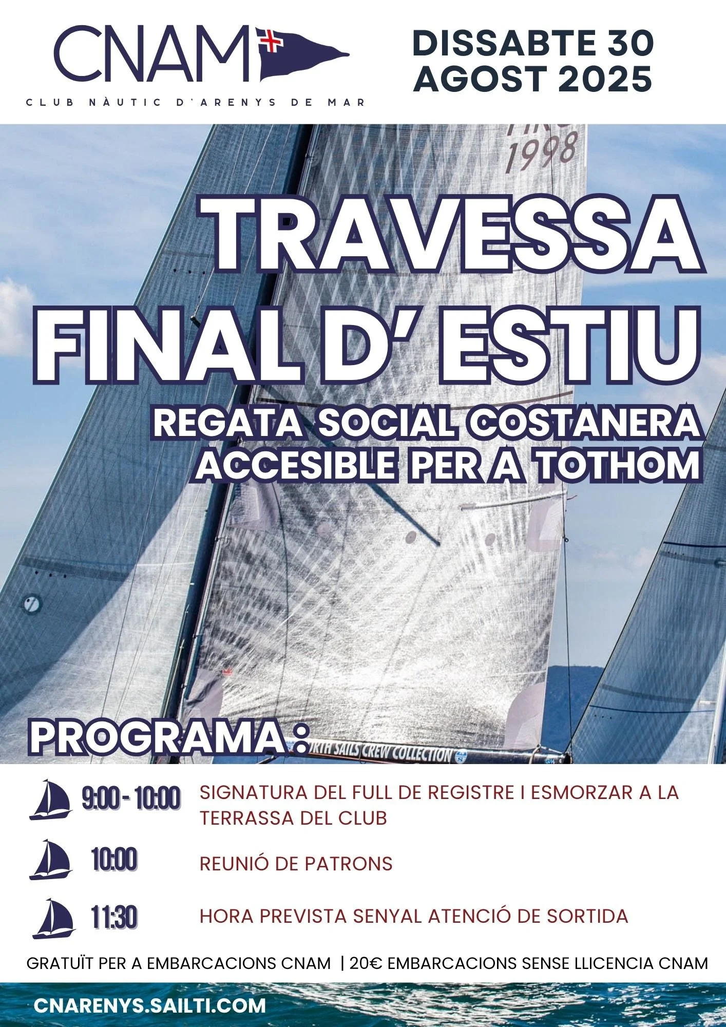 El Club Nàutic d’Arenys de Mar organitza el pròxim dissabte 30 d’agost de 2025 la tradicional Travessa Final d’Estiu, una regata social costanera i accessible per a tothom.